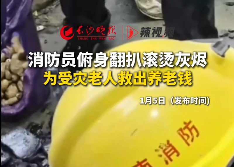 消防员俯身翻扒滚烫灰烬,为受灾老人救出养老钱