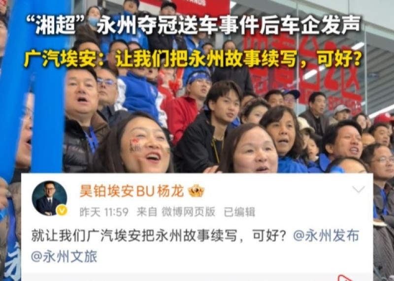 “湘超”永州夺冠送车事件后车企发声 广汽埃安:让我们把永州故事续写,可好?
