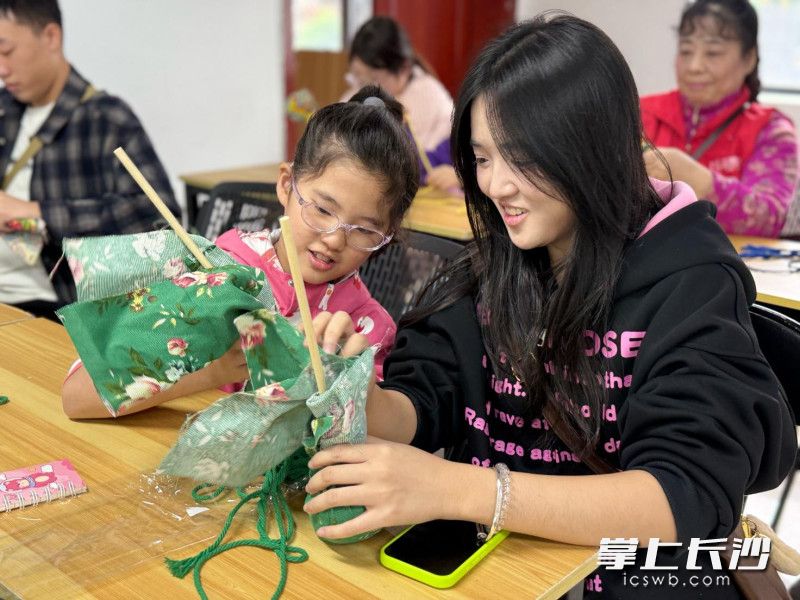 志愿者们在制作初期略显生疏,过程中或出现艾草填充厚薄不均、缝线不够规整等情况。一旁的大学生志愿者主动上前帮忙,活动室内不时响起“姐姐,这样操作是否正确?”“哥哥,您看我制作的成品如何?”等询问声,欢声笑语与艾草清香交织,氛围格外温馨。