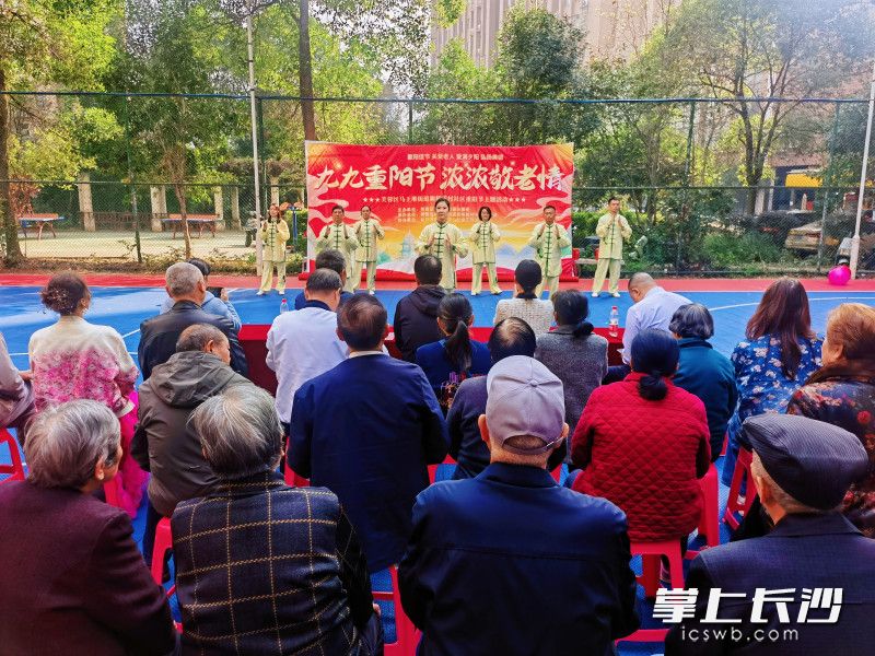 欢快的舞蹈《太阳出来照四方》拉开重阳节活动的序幕。湖南省农业广播学校带来的养生操《马王堆导引术》将现场气氛活跃起来。接着,由芙蓉区老干部交谊舞协会带来的舞蹈《我的祖国》尽显风采;同时睦邻养老中心舞蹈队的阿姨们带来节奏明快的舞蹈《相思月》;新桥中心幼儿园的孩子们也将精心准备的节日卡片送给爷爷奶奶们,并为其按摩、捶背,老人们脸上洋溢着欣慰的笑容。活动过程中还穿插了幸运抽奖、互动游戏等,让活动增添不少趣味性。现场还有马王堆街道社区卫生服务中心的家庭医生团队免费为老年朋友提供血压、血糖、DPCC测量服务。