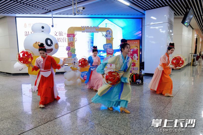 在人流密集的五一广场站,项目方同步举办了线下快闪活动。活动现场,以宋式美学为灵感的汉服舞蹈表演,营造出与传统温泉文化相契合的静谧氛围。同时,魔术互动与卡通人偶吸引了众多年轻乘客与亲子家庭驻足参与,显示其面向广泛客群的定位。