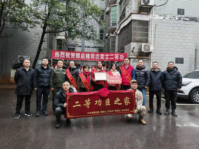 “郭启锋同志荣立二等功,既是他个人的光荣,也是家庭的骄傲,更是芙蓉人民的自豪。”区人民武装部上校部长余旭东向军属道贺;区退役军人事务局局长殷政为家属披上“一人立功,全家光荣”的鲜红绶带,并共同为牌匾揭幕,鎏金牌匾熠熠生辉,映照出家属的自豪与荣光。