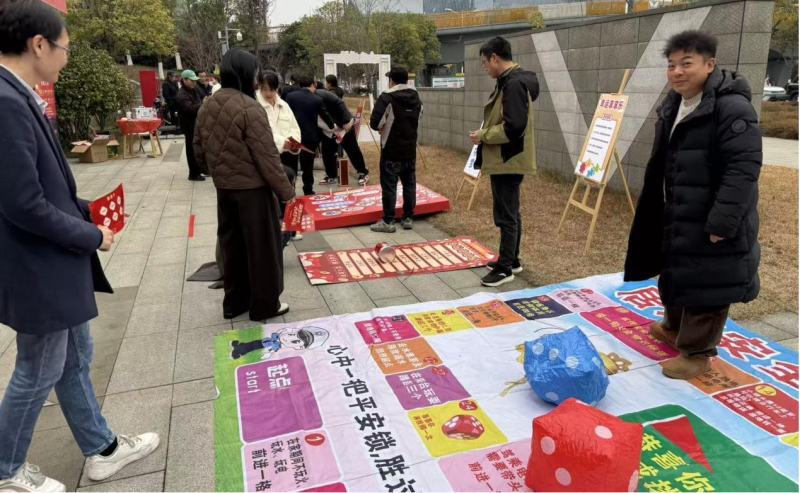 团圆会结束后,新春游园会正式开始。“新春写对联”摊位前,书法爱好者挥毫泼墨,一幅幅饱含祝福的春联跃然纸上;“非遗拓福”与“剪窗花”区域,居民们亲手拓印福字、剪出灵动窗花,感受传统文化的魅力;投壶、套圈摊位前排起长队,大人小孩全情投入,在游戏中收获惊喜礼品;“幸运滚滚来”和“安全大闯关飞行棋”则将趣味与安全知识相结合,让居民在玩乐中学习应急避险小常识。