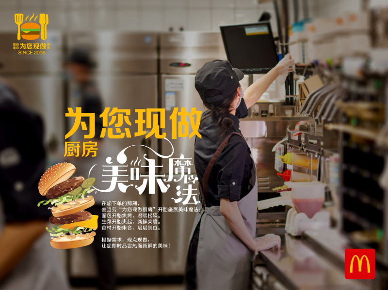 “为您现做”是麦当劳独特的厨房模式,代表了麦当劳对每一位顾客独特需求的关注。区别于批量制作后等待顾客下单的传统厨房模式,麦当劳“为您现做厨房”基于数字化系统和厨房员工间的高效配合,能够实现顾客下单后,再根据需求进行搭配和出餐。作为快餐行业内首创的厨房模式,“为您现做厨房”在数字化系统和厨房设备上大胆创新并不断升级,持续为顾客带来热而新鲜的美味、个性化的定制选择和即时的用餐体验。