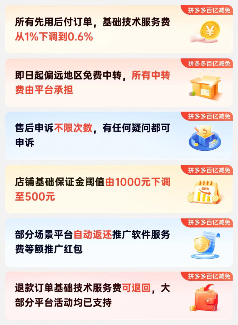 拼多多继续推动“百亿减免”计划,先用后付订单服务费全部降至6折