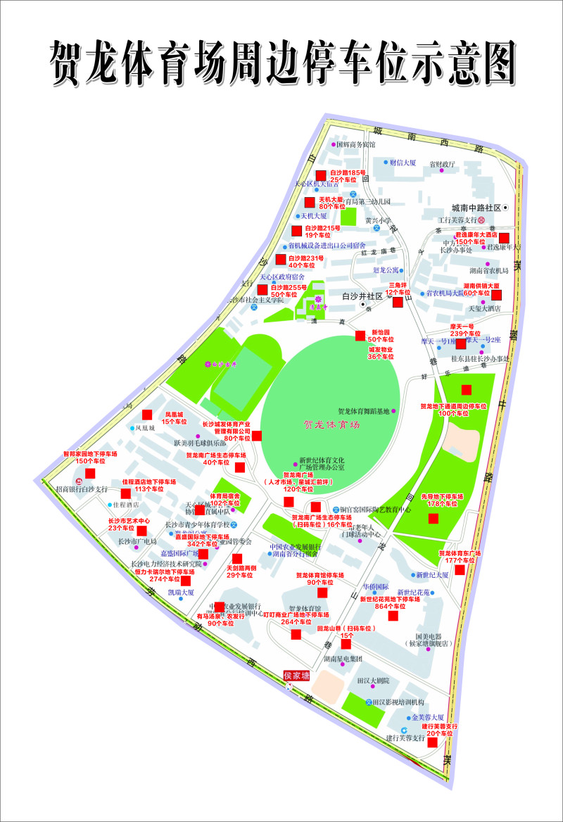 具体分布为:白沙路沿线229个,芙蓉路沿线1788个,劳动路沿线958个,贺龙体育馆附属停车场342个。点击进入一键导航>>3317个停车位助你轻松观赛