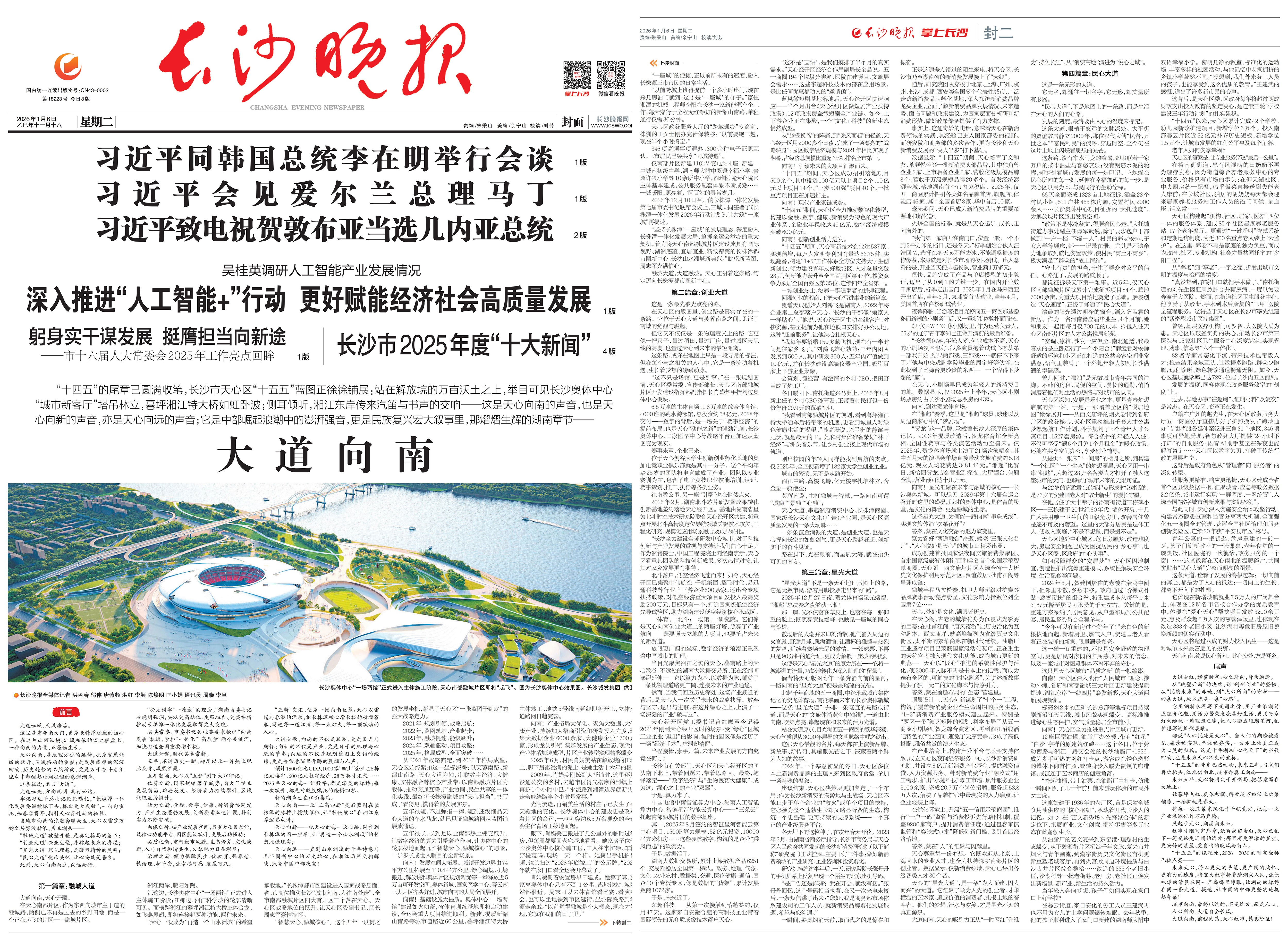 “十四五”的尾章已圆满收笔,长沙市天心区“十五五”蓝图正徐徐铺展:站在解放垸的万亩沃土之上,举目可见长沙奥体中心“城市新客厅”塔吊林立,暮坪湘江特大桥如虹卧波;侧耳倾听,湘江东岸传来汽笛与书声的交响——这是天心向南的声音,也是天心向新的声音,亦是天心向远的声音;它是中部崛起浪潮中的澎湃强音,更是民族复兴宏大叙事里,那熠熠生辉的湖南章节——