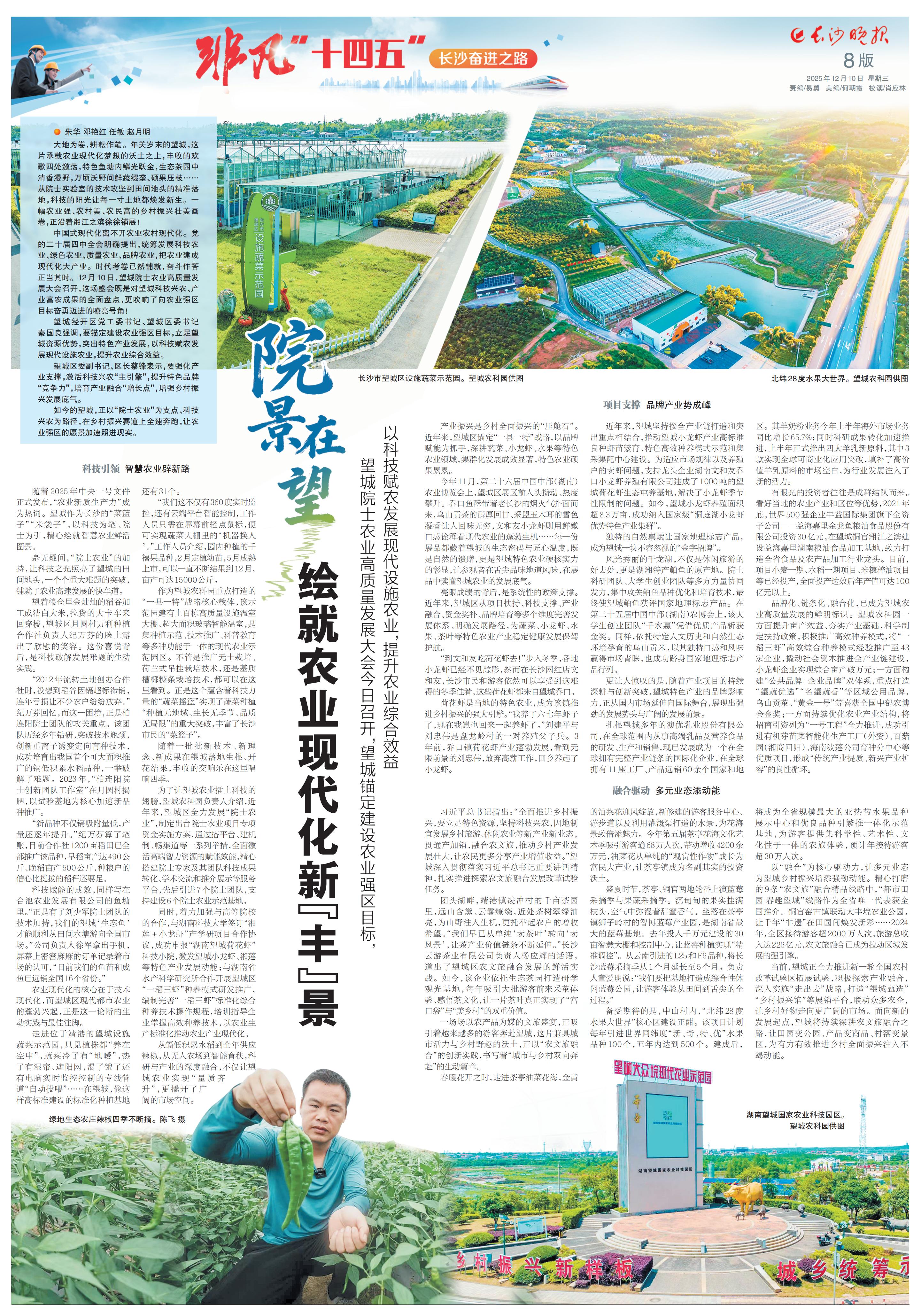 中国式现代化离不开农业农村现代化。党的二十届四中全会明确提出,统筹发展科技农业、绿色农业、质量农业、品牌农业,把农业建成现代化大产业。时代考卷已然铺就,奋斗作答正当其时。12月10日,望城院士农业高质量发展大会召开,这场盛会既是对望城科技兴农、产业富农成果的全面盘点,更吹响了向农业强区目标奋勇迈进的嘹亮号角!