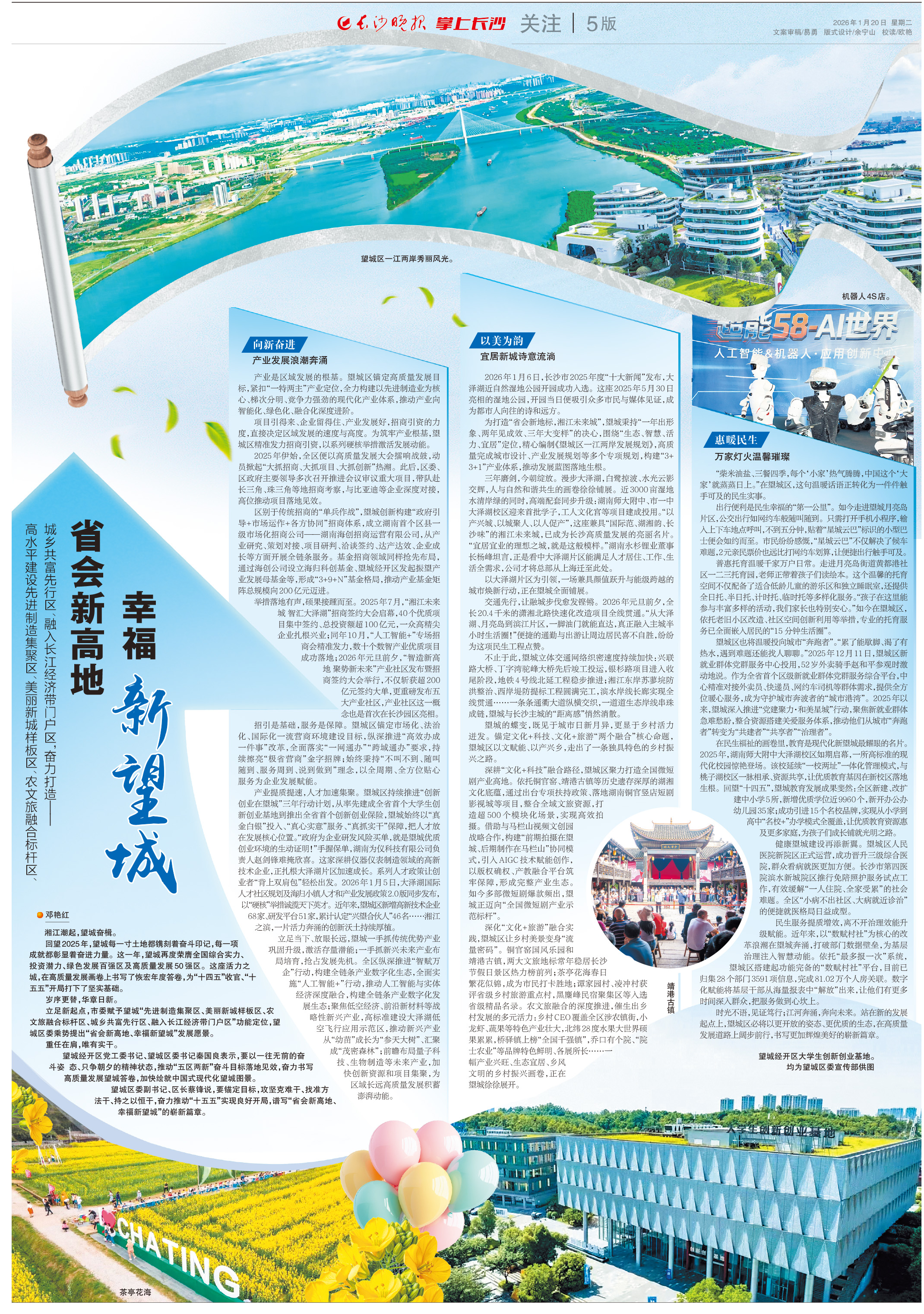 立足新起点,市委赋予望城“先进制造集聚区、美丽新城样板区、农文旅融合标杆区、城乡共富先行区、融入长江经济带门户区”功能定位,望城区委乘势提出“省会新高地、幸福新望城”发展愿景。