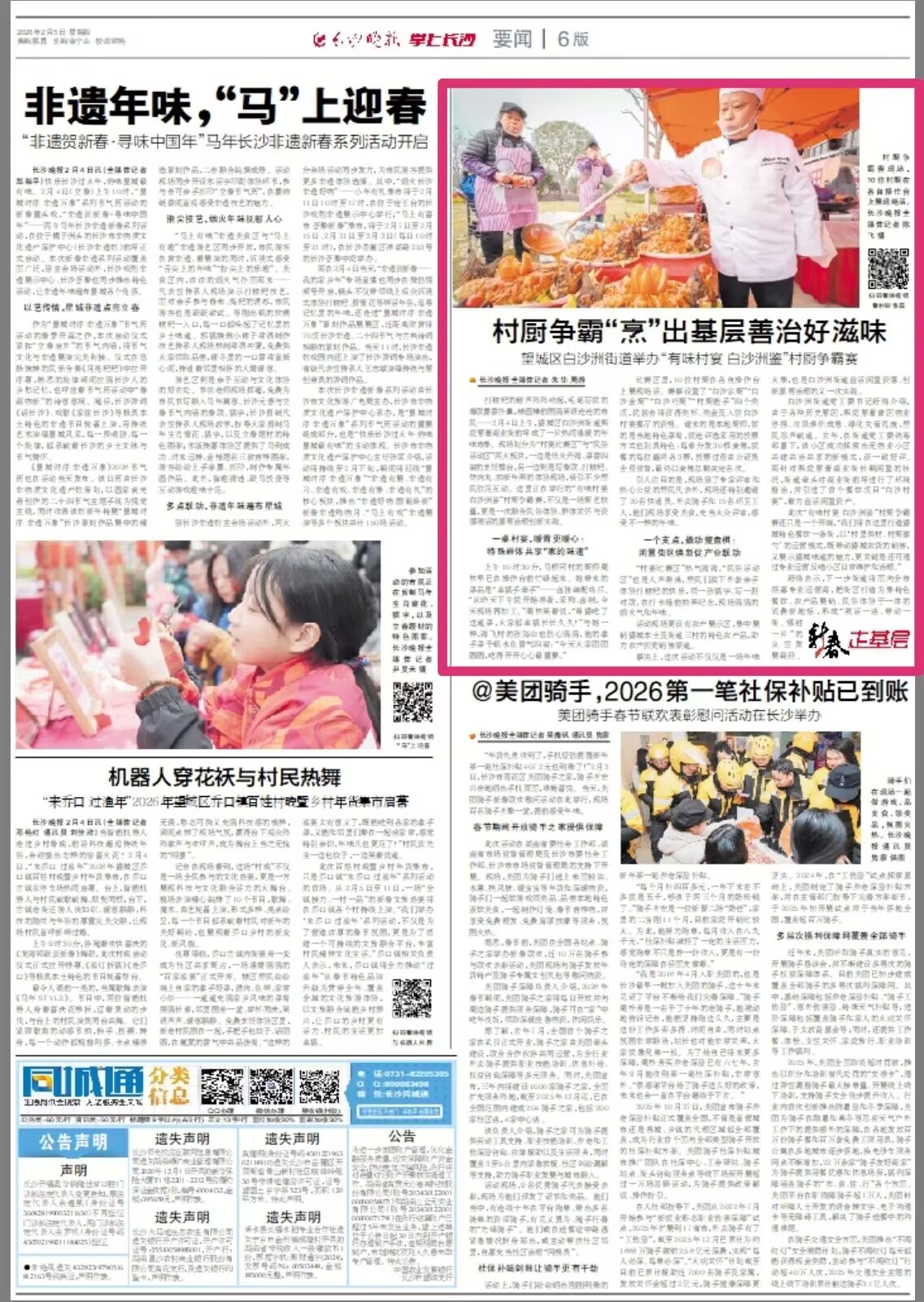 打糍粑的锤声阵阵响起,毛笔写就的春联墨香扑鼻,糖画摊前围满笑语连连的市民……2月4日上午,望城区白沙洲街道熙庭原著商业街前坪成了一片热闹温暖的年味市集。现场划分为“村宴比赛区”与“民俗活动区”两大板块,一边是灶火升腾、菜香四溢的烹饪擂台,另一边则是写春联、打糍粑、炸肉丸、拍新年照的体验现场,吸引不少居民驻足互动。这里正在举行的“有味村宴 白沙洲鉴”村厨争霸赛,不仅是一场厨艺较量,更是一次融合民俗体验、群体关怀与资源激活的基层治理创新实践。