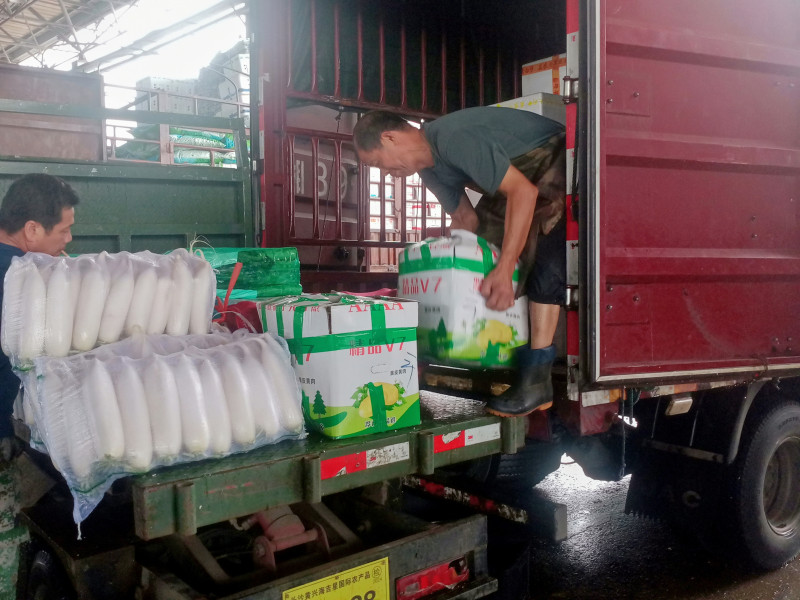 记者看到,尽管天空阴雨连绵,物流园内仍人头攒动,车辆穿梭不停,不少二级市场的采购车提前到达市场进行装车、发车,一片繁忙景象。