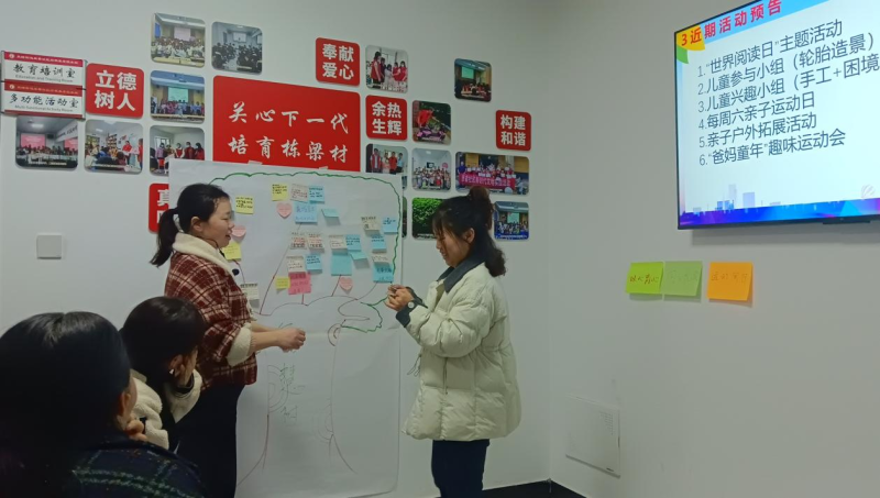实操工作坊环节,志愿者分组围绕“金点子收集”“活动风险预判”等议题展开讨论。各队伍结合自身优势各抒己见:早教队分享0至3岁幼儿互动经验,书法协会提议将传统文化融入儿童活动,手工队展示简易材料课程设计,阅读队畅想世界阅读日故事会,运动队贡献亲子运动设计妙招,家庭教育队建议增设亲子“心灵碰撞”环节。现场“智慧树”共创墙上贴满五彩便利贴,汇聚成社区服务“金点子”宝典。
