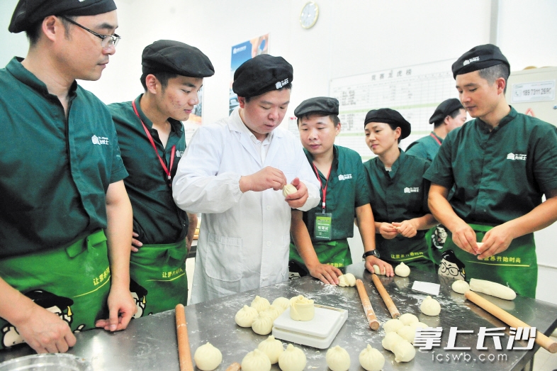 吴达求(左三)在向员工传授手工制作包子的传统技艺。长沙晚报记者 贺文兵 摄