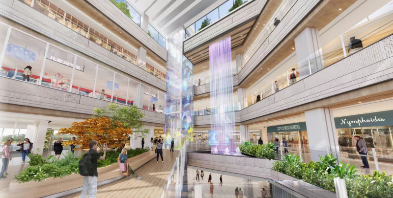 购物中心的屋顶设计颇具特色,打造了面积达800平方米的屋顶公园,配备可移动遮阳棚、喷雾降温系统、浅水戏水池等设施,形成全天候广场。四层还设有绿意盎然的草坪广场,自然光线透过天窗洒落,顾客可自由穿梭于屋顶广场与草坪广场之间。