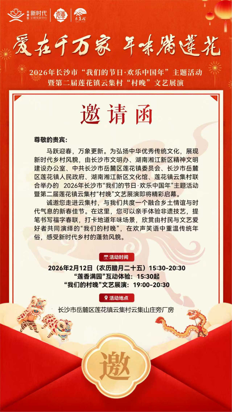 据悉,本次活动由长沙市文明办等单位指导,湖南湘江新区精神文明建设办公室、中共长沙市岳麓区莲花镇委员会、莲花镇人民政府等共同主办,云集村村民委员会承办。诚邀您走进乡村,赏文艺、品年味,在欢声笑语中迎接一个热气腾腾的中国年。