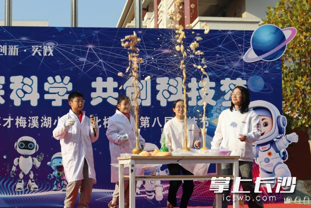 当日上午,校园田径场彩旗招展、掌声阵阵,科技节正式拉开帷幕。博才梅溪湖小学北校区校长段建在致辞中说,希望全体同学以科技节为契机,在探索中感受科学魅力,在实践中勇攀创新高峰。随后,活力满满的科技主题舞蹈点燃全场氛围,而系列神奇科学实验秀更将现场热度推向高潮。“肺活量大挑战”引发师生阵阵欢呼;“大象牙膏”实验中喷涌而出的白色泡沫如瀑布般壮观;“火焰掌”里红色火焰在掌心跳跃;“干冰大爆炸”化作漫天白雾营造出奇幻意境,同学们的惊叹声与欢呼声此起彼伏。最后,缤纷气球盛宴为开幕式画上圆满句号,孩子们的笑脸与纷飞的气球相映成趣。