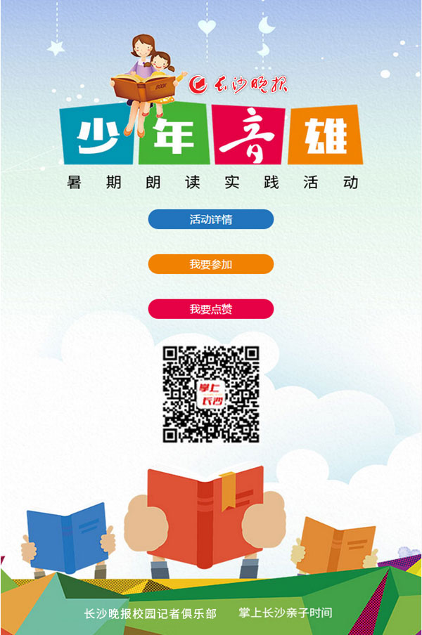 长沙晚报掌上长沙特别推出暑期少儿朗诵活动“少年音雄”,帮助孩子养成爱阅读的好习惯,丰富孩子的暑期生活,拉近您与孩子间的距离。快和孩子一起参与进来吧!