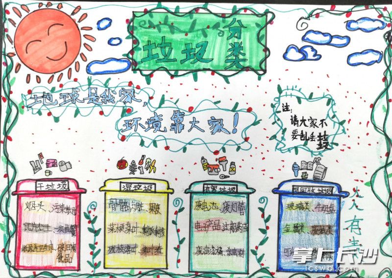 麻园岭小学校长罗婧介绍,学校历来重视垃圾分类的教育,先后举办了系列垃圾分类主题活动。今年暑假,学校还给每一位孩子布置了垃圾分类有关的作业,开学时,孩子们向学校递交了一幅幅精美的漫画、一张张创意手抄报,来呼吁垃圾精准分类。