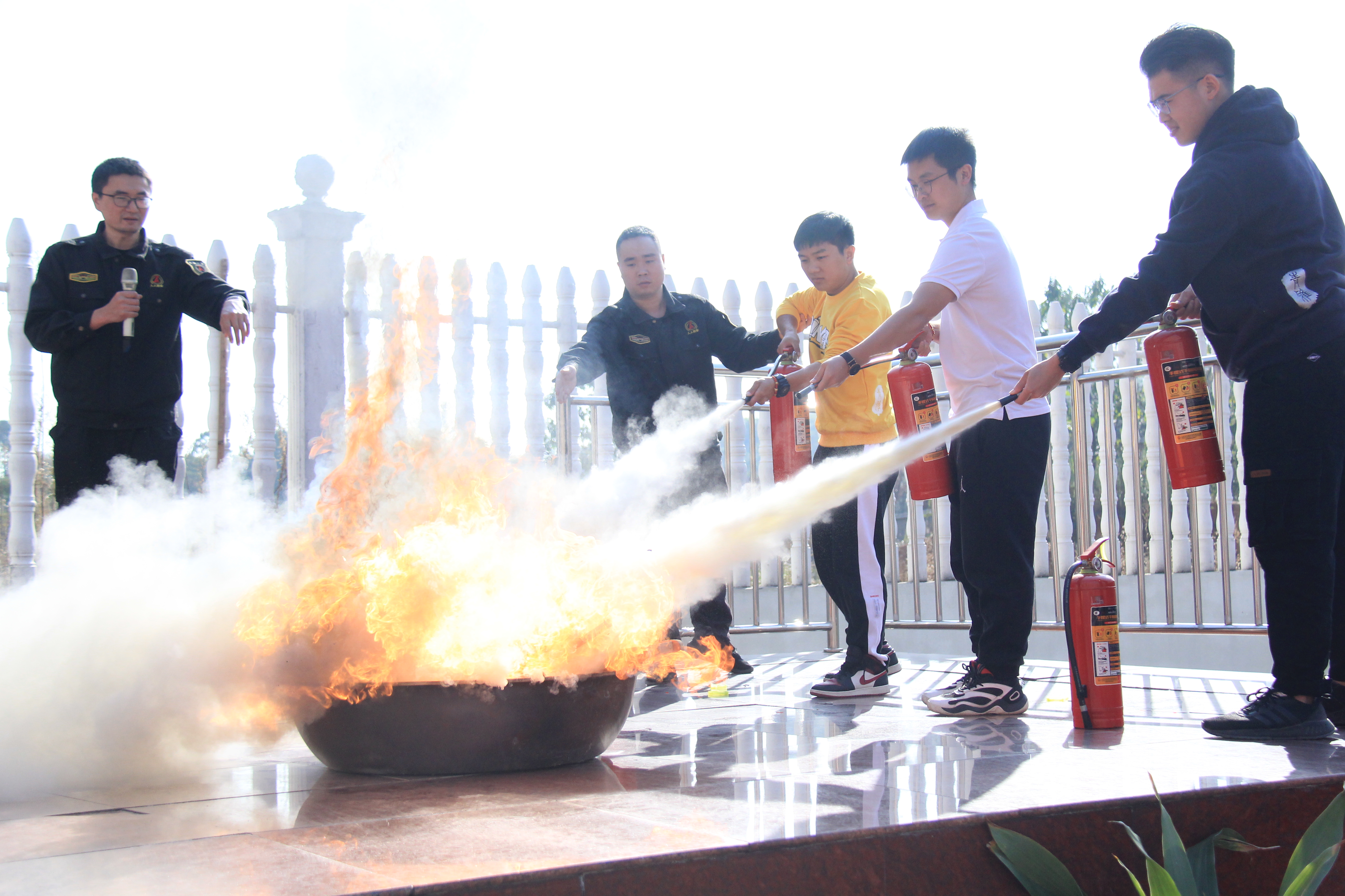 青雅丽发学校的老师们在教官指导下用灭火器灭火。