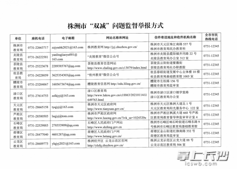 长沙晚报掌上长沙10月28日讯(全媒体记者 刘俊)今日,记者从省教育厅获悉,为贯彻落实中共中央办公厅、国务院办公厅《关于进一步减轻义务教育阶段学生作业负担和校外培训负担的意见》,建立健全全省“双减”问题监督举报长效机制,培育良好生态,确保“双减”工作任务落实落地,省教育厅、省市场监督管理局公布省、市、县三级教育部门和市场监督部门“双减”问题监督举报方式。