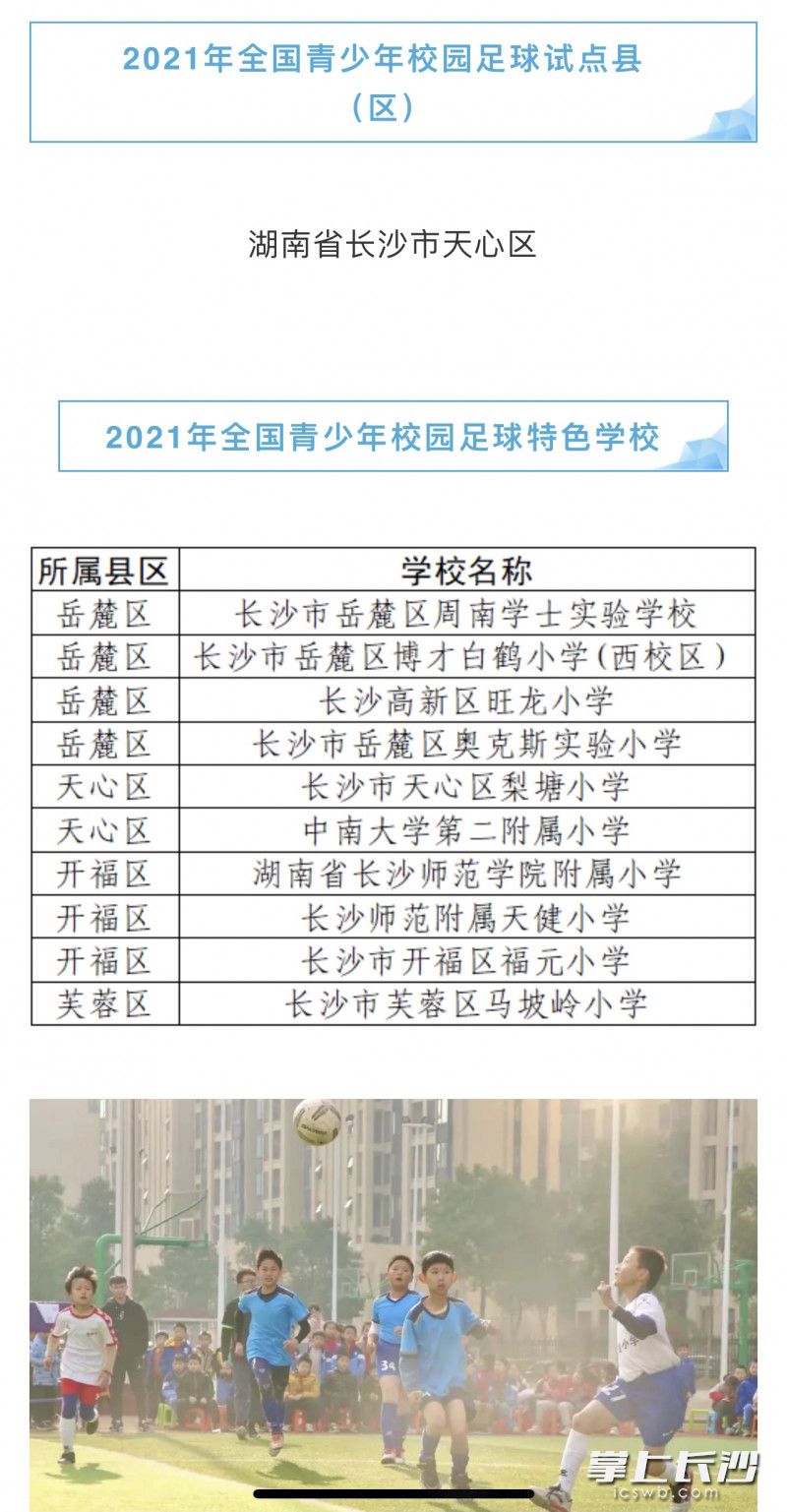 长沙晚报掌上长沙2月7日讯(全媒体记者 岳霞 通讯员 邓琼)昨晚,中国女足亚洲杯夺冠刷屏,铿锵玫瑰在绿茵场上的怒放,让人心潮澎湃。长沙贯彻落实“五育并举”育人方针,重视体育教育,足球运动已成为校园里一道亮丽的风景线。近日,教育部对2021年全国青少年校园足球试点县(区)、特色学校、特色幼儿园拟认定结果进行了公示,长沙1个区、10所学校、13所幼儿园成功入选。