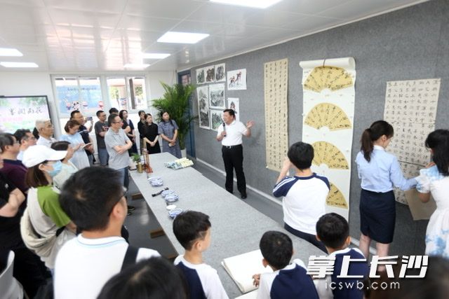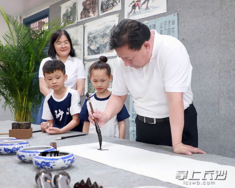 湖南省文联主席、中国书协副主席、湖南省书协主席鄢福初,省书协副主席、中书协会员、中南大学教授罗红胜,省书协教育委员会秘书长、中书协会员范晓亮,省书协副秘书长、中书协会员陈寰……走进砂子塘小学的书法名家们铺宣挥毫,为老师们进行现场示范。以文化人,以艺通心,在传承中彰显人文情怀,让师生们零距离感受中华传统书画的魅力。