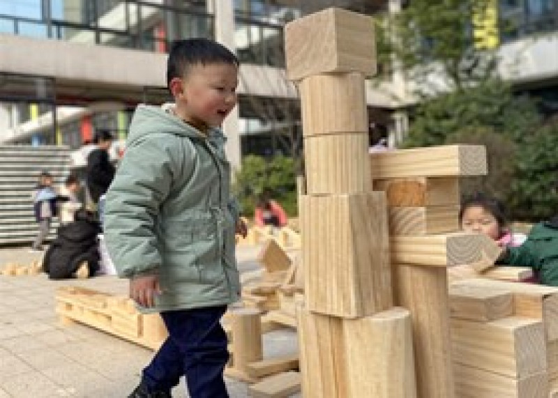 建构区,孩子们正在用大小不一的木料“建房子”、搭“建筑”;沙水区,不少孩子在快乐地玩沙子、玩水;涂鸦区,孩子们用五彩涂料在墙上画画、涂抹;操场上,几个孩子正在踩滚筒;水池里,六七个穿着防水裤的孩子在捉泥鳅……上午10时左右,童心幼儿园的户外场地上,孩子们自主选择最喜欢的游戏项目,自由自在地拼搭、钻爬、奔跑,处处充满孩子们的欢声笑语。