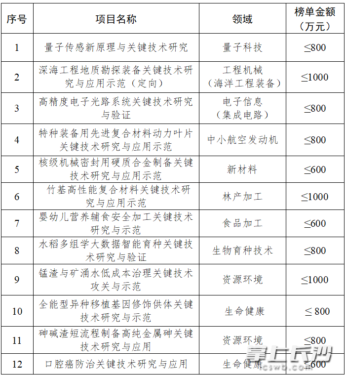 榜单设置坚持“四个面向”,对接国家重大战略任务,聚焦制约湖南省现代化产业体系中最紧迫的“卡脖子”重大技术难题,生命健康、资源环境等民生领域公益性技术攻关和重点基础前沿领域研究任务,共遴选出2023年省重大科技攻关“揭榜挂帅”制项目12个,具体为:“量子传感新原理与关键技术研究”“深海工程地质勘探装备关键技术研究与应用示范(定向)”“高精度电子光路系统关键技术研究与验证”“特种装备用先进复合材料动力叶片关键技术研究与应用示范”“核级机械密封用硬质合金制备关键技术研究与应用示范”“竹基高性能复合材料关键技术研究与应用示范”“婴幼儿营养辅食安全加工关键技术研究与示范”“水稻多组学大数据智能育种关键技术研究与验证”“锰渣与矿涌水低成本治理关键技术攻关与示范”“全能型异种移植基因修饰供体关键技术研究与示范”“砷碱渣短流程制备高纯金属砷关键技术研究与应用”“口腔癌防治关键技术研究与应用”。