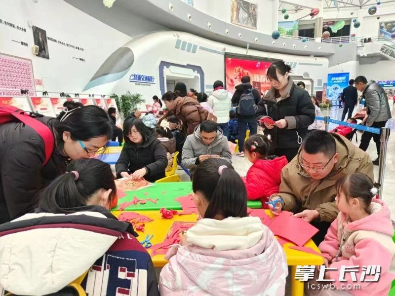 为了增添节日的喜庆氛围,省科技馆在大厅推出了“画龙点睛”“以剪绘龙”等新春游园环节,邀请亲子现场共绘龙年长卷、一同剪窗花。此外,“蒙眼敲响新年锣”、丢飞盘、投壶等符合节日气氛的传统项目也吸引了众多孩子们参与。