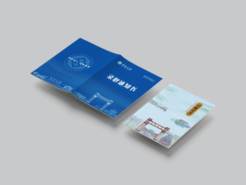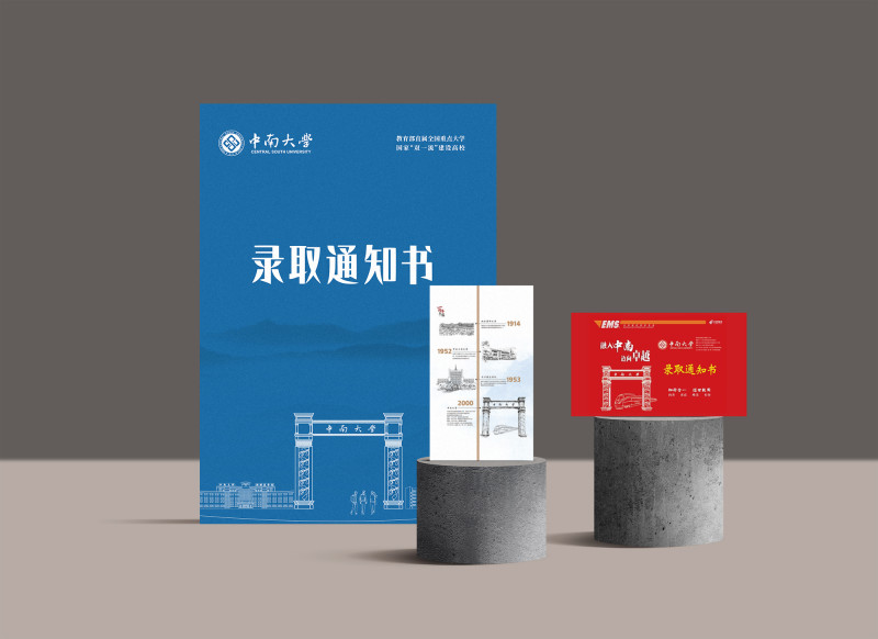 打开中南大学录取通知书快递信封,映入眼帘的VIS中南蓝色调。录取通知书封面融入岳麓山(依巍巍岳麓)以及线条构图的学校地标建筑,整体简洁、大方。