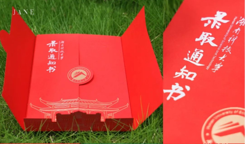 今年湖南大学的录取通知书依然以“湖大红”为主基调,提取校牌、岳麓书院、大礼堂、超算中心等地标元素,端庄秀丽,古典之美跃然纸上,映射出千年学府绵延不断的文化底蕴。