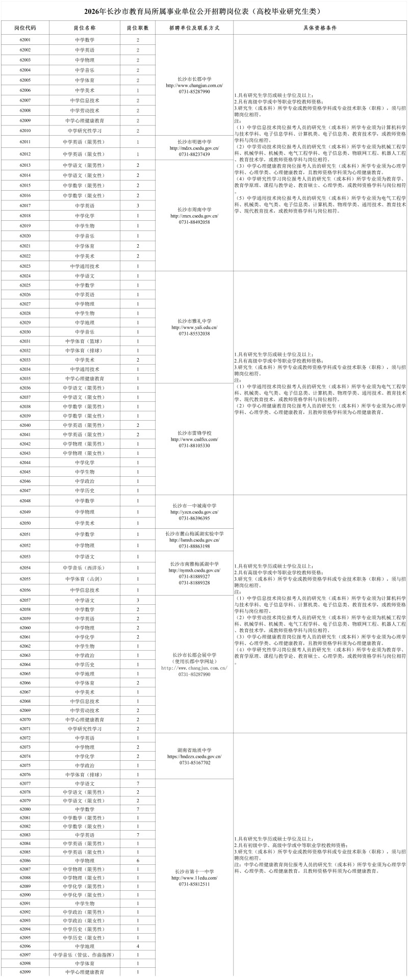 长沙晚报掌上长沙10月17日讯(全媒体记者 岳霞)记者今日从长沙市教育局获悉,《2026年长沙市教育局所属事业单位公开招聘教职工公告》发布,长沙市教育局38个事业单位计划招聘662名教职工,招聘对象为公费师范生、高校毕业研究生、骨干教师、学科竞赛教练和体育教练员。录取人员列入相应事业单位编制,实行合同聘用制管理,其岗位等级按事业单位新进人员有关规定执行。录取聘用为完全中学的教学人员由招聘学校统筹安排教学岗位。