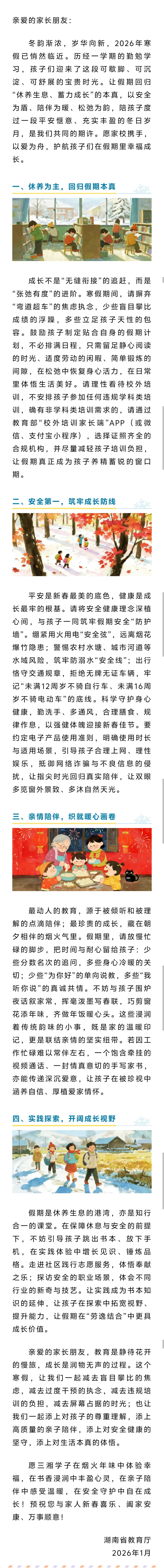 长沙晚报掌上长沙1月26日讯(全媒体记者 张炎炎)2026年寒假将至,湖南省教育厅今日向全省中小学生家长发出一封题为《难得美好时光,一起幸福成长》的公开信,呼吁家长共同守护假期“休养生息、蓄力成长”的本真,以安全、陪伴和松弛为基调,引导孩子度过一段平安、充实、幸福的冬日时光。