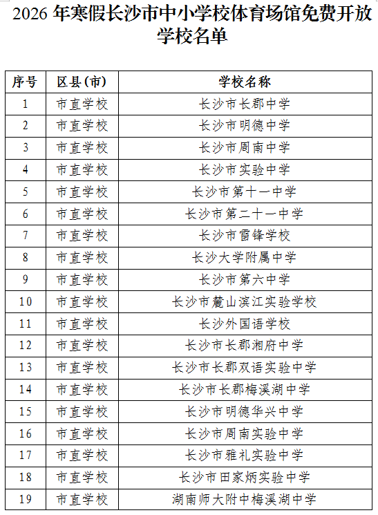 寒假期间,长沙市358所公办学校体育场地设施将免费向社会公众开放