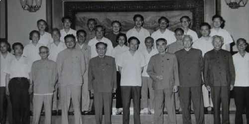1972年,周恩来总理接见杨振宁及中国科学家。二排右一为邓稼先。