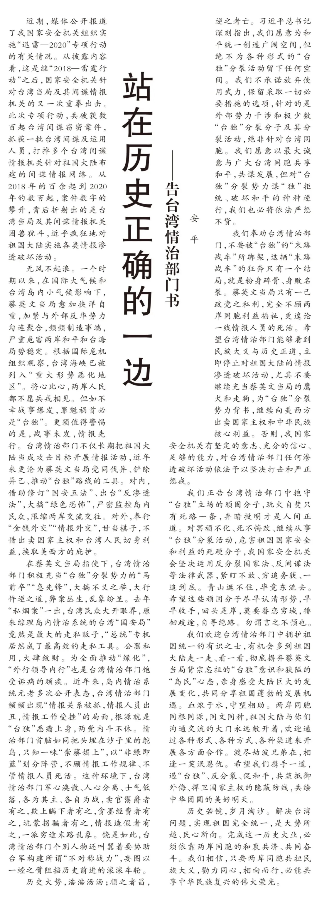 无风不起浪。一个时期以来,在国际大气候和台湾岛内小气候影响下,蔡英文当局愈加挟洋自重,加紧与外部反华势力勾连聚合,频频制造事端,严重危害两岸和平和台海局势稳定。根据国际危机组织观察,台湾海峡已被列入“重大形势恶化地区”。将心比心,两岸人民都不愿兵戎相见。但如不幸战事爆发,罪魁祸首必是“台独”。更须值得警惕的是,战事未发,情报先行。台湾情治部门不仅长期把祖国大陆当成攻击目标开展情报活动,近年来更沦为蔡英文当局党同伐异、铲除异己、推动“台独”路线的工具。对内,借助修订“国安五法”、出台“反渗透法”,大搞“绿色恐怖”,严密监控岛内民众,限缩两岸交流交往。对外,奉行“金钱外交”“情报外交”,甘当棋子,不惜出卖国家主权和台湾人民切身利益,换取美西方的庇护。