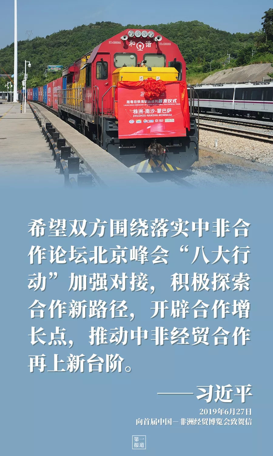 2019年,习近平主席向首届中非经贸博览会致贺信表示,希望双方围绕落实中非合作论坛北京峰会“八大行动”加强对接,积极探索合作新路径,开辟合作增长点,推动中非经贸合作再上新台阶。