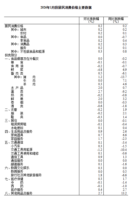 长沙晚报掌上长沙2月11日讯 据国家统计局网站消息:2026年1月份,全国居民消费价格同比上涨0.2%。其中,城市上涨0.2%,农村上涨0.1%;食品价格下降0.7%,非食品价格上涨0.4%;消费品价格上涨0.3%,服务价格上涨0.1%。