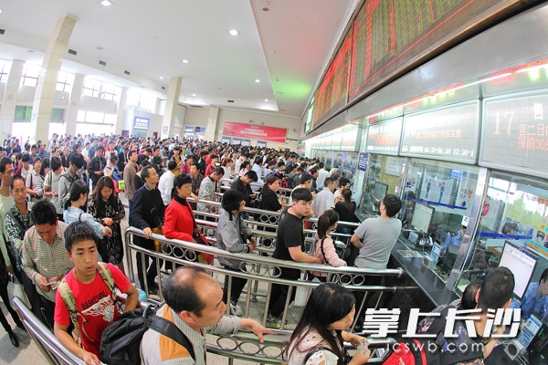 4月30日,五一小长假第一天,长沙火车站迎来了一次客流高峰,火车站售票大厅内,出行的旅客已经排起了长队。长沙晚报记者 陈飞 摄