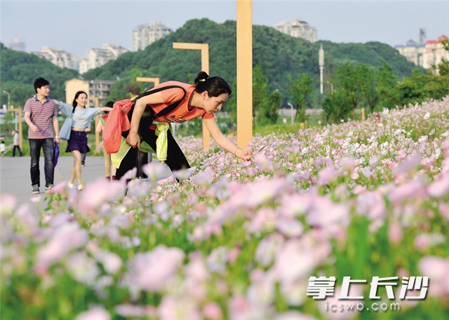 西湖文化园内,一处盛放的花海吸引了众多市民驻足观赏。 长沙晚报记者 王志伟 邹麟 摄影报道
