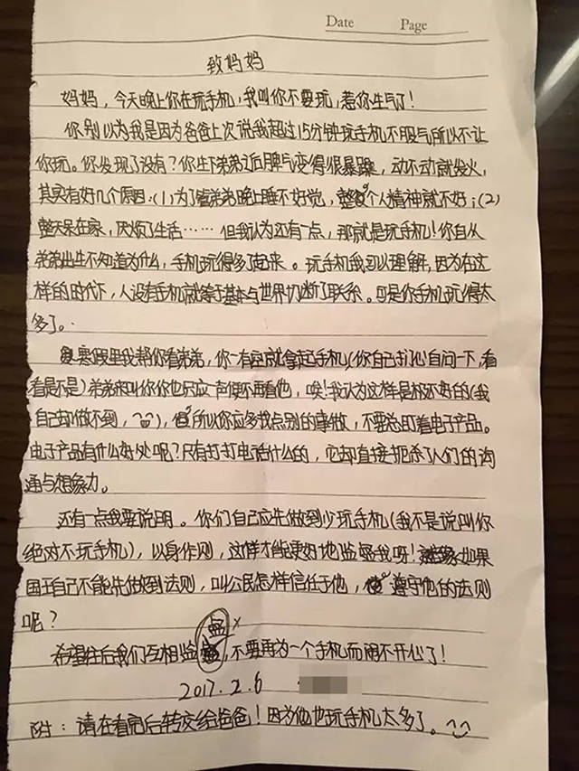 长沙晚报掌上长沙2月9日讯 据都市快报消息 昨天傍晚,骆女士来电:“我女儿小学6年级,12岁,她给我写了一封信,她说家长限制孩子玩手机,首先家长要以身作则,自己少玩手机。我把信发了朋友圈,引起很多共鸣。评论很有意思的,我发给你们看看。”