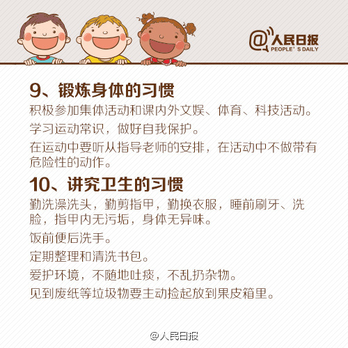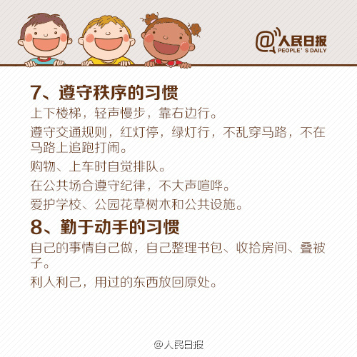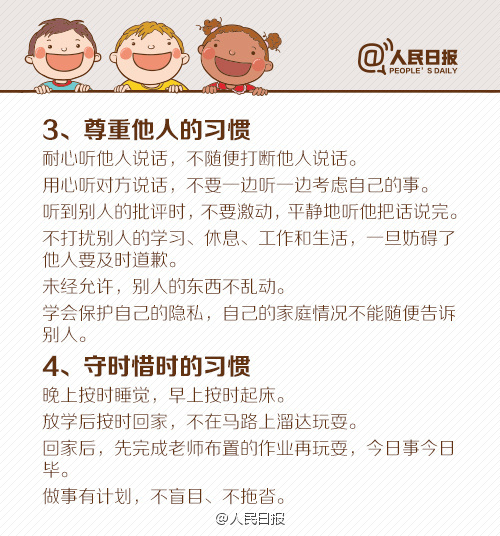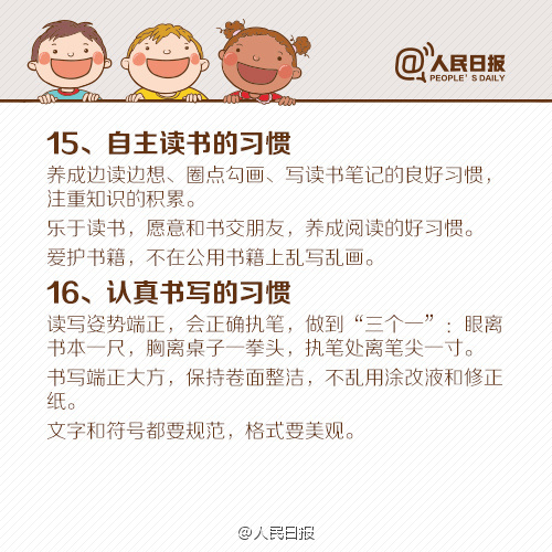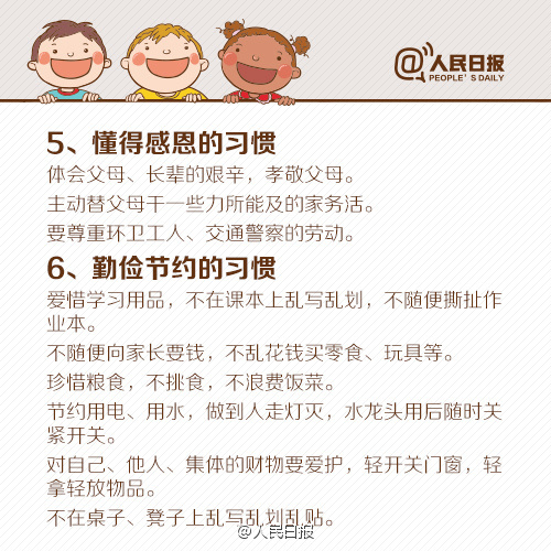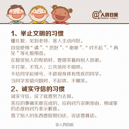 儿童阶段是习惯养成的黄金时期,这个时期培养孩子的行为习惯成效最大,一旦错过不只事倍功半,甚至终身难以弥补。孩子应养成哪些好习惯?举止文明、诚实守信、自主阅读……