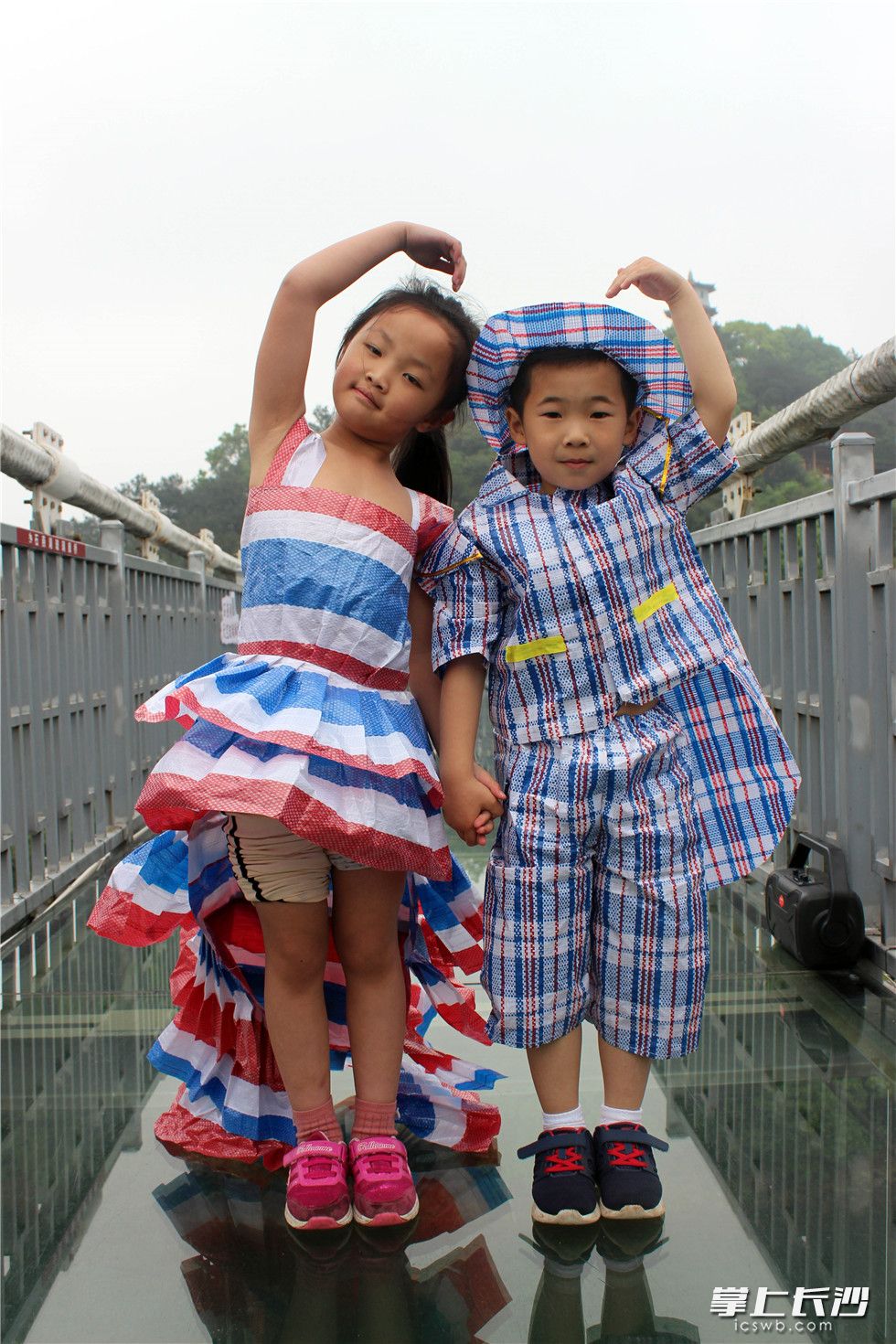 身着锡箔纸环保衣的萌娃在玻璃桥上走秀