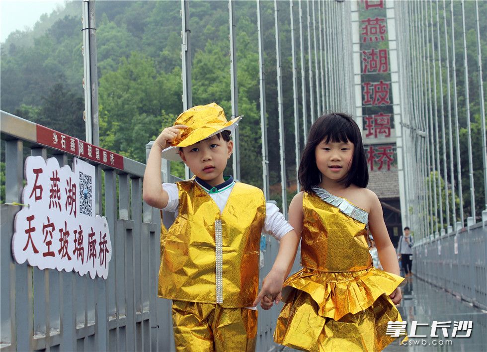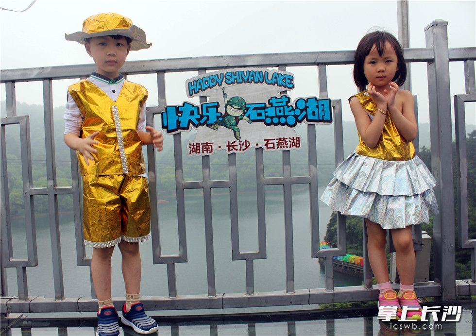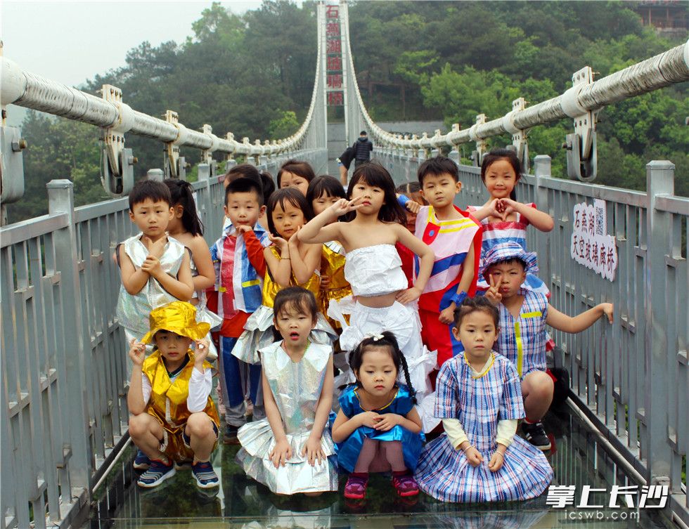 萌娃们在石燕湖玻璃廊桥环保走秀迎接“世界地球日”。