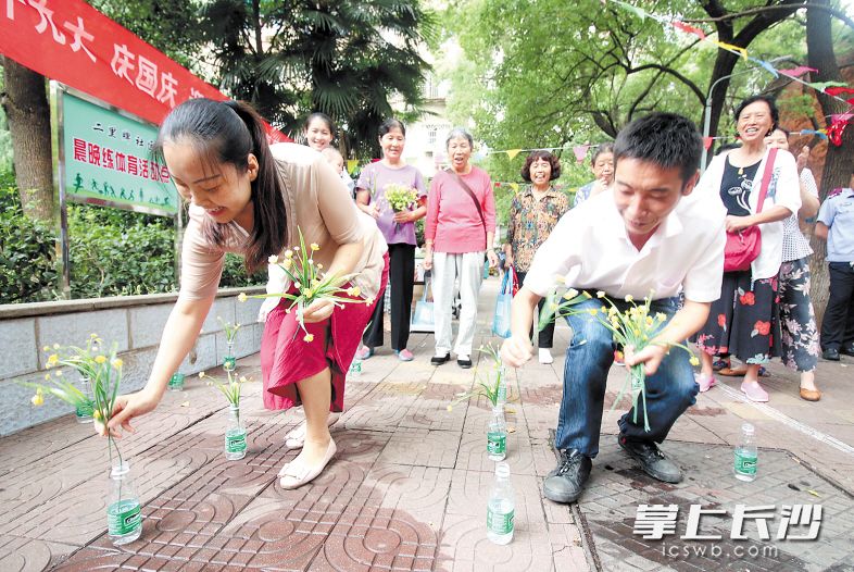 弯下身子,将手中的穗花插入一排排矿泉水瓶中;拿起吸管将乒乓球牢牢吸住后,从一个碗送到另一个碗……日前,芙蓉区朝阳街道二里牌社区举行的“中秋喜乐会”上,赛插花、夹弹珠等一系列趣味运动项目吸引上百居民参与,活动现场欢笑四起。长沙晚报记者 胡媛媛 摄