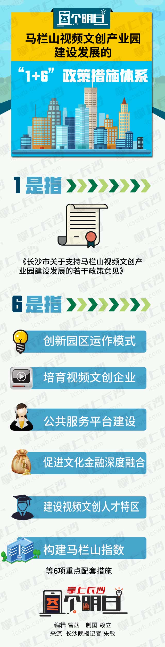 目前,马栏山已完成征地拆迁进入招商阶段,正在探索开展视频文创类高新技术企业认定、股权激励、外资准入、金融投贷联动等一系列试点示范。《政策》中的“1”是指《长沙市关于支持马栏山视频文创产业园建设发展的若干政策意见》,“6”是指创新园区运作模式、培育视频文创企业、公共服务平台建设、促进文化金融深度融合、建设视频文创人才特区、构建马栏山指数等6项重点配套措施。