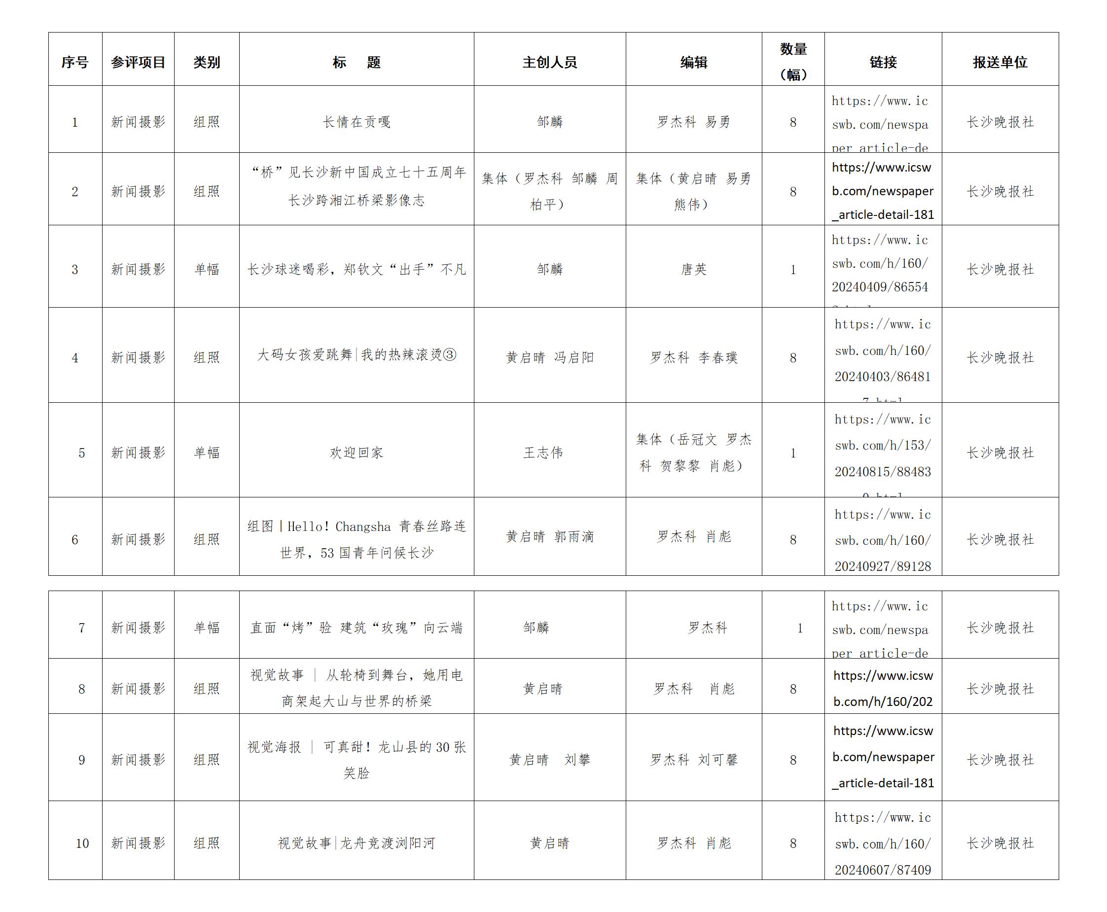 根据湖南省新闻工作者协会《关于开展2024年度湖南新闻奖参评作品报送工作的通知》有关要求,长沙晚报社拟推荐以下10件新闻摄影作品参评2024年度湖南新闻奖,现予以公示。如有不同意见,可反馈至长沙晚报总编室。