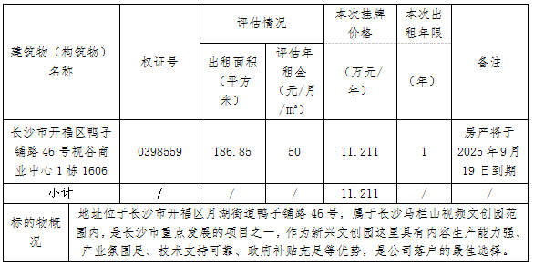 长沙视谷商业中心1栋1606室办公用房招租公告 稿源:长沙晚报2025-09-23 14:29 相链区块链 该文章已上链>> 您的浏览器不支持 video 标签。 您的浏览器不支持 audio 标签。 长沙市开福区鸭子铺路46号视谷商业中心1栋1606室办公用房标的于2025年9月19日起进行公开租赁,现向社会公告并征集承租方。租赁资产明细清单——房屋建筑物(构筑物)咨询电话: 羊女士 15974227164长沙晚报翰飞数媒文化科技有限公司2025年9月22日 【作者:】 【编辑:刘天乐】 长沙晚报社版权声明 关键词: >>我要举报