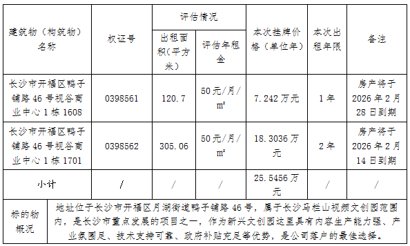 长沙视谷商业中心1栋1608、1701室办公用房招租公告 稿源:长沙晚报2026-02-13 14:14 相链区块链 该文章已上链>> 您的浏览器不支持 video 标签。 您的浏览器不支持 audio 标签。 长沙市开福区鸭子铺路46号视谷商业中心1栋1608、1701室办公用房标的于2026年2月13日起进行公开租赁,现向社会公告并征集承租方。租赁资产明细清单——房屋建筑物(构筑物)咨询电话: 羊女士 15974227164长沙晚报翰飞数媒文化科技有限公司2026年2月13日 【作者:】 【编辑:刘天乐】 长沙晚报社版权声明 关键词: >>我要举报