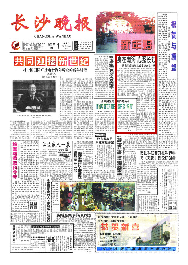 谈到长沙的变化,康政委说是翻天覆地的。过去只有中山路一条主街,如今五一中路横穿长沙非常壮观。提起家乡菜,红菜苔子、臭干子、辣椒萝卜……他说起来津津有味。他说,可惜得了咽喉炎,不敢吃辣椒了。最后,康政委还托记者向长沙父老乡亲拜年,致以美好的祝愿。 (长沙晚报1995年1月1日报道)